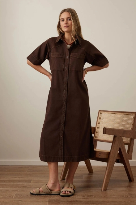Meet the Short Sleeve Yoke Detail Midi Dress based off the best-selling long sleeve version. This style is boxy and more relaxed so size down if you prefer a slimmer fit. This dress is designed with a mid weight cotton twill with 30% lyocell that drapes gently. This dress will become your go-to. The curved yoke and sleeve seam detail add a touch of understated style, while the longer midi length ensures effortless wear throughout the seasons.