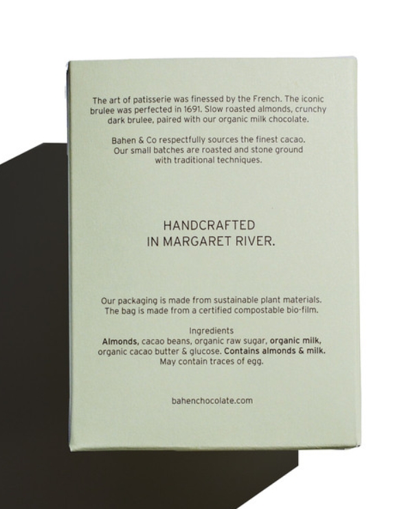 The art of patisserie was perfected by the French. The iconic brulee was perfected in 1961. Slow roasted almonds, crunchy dark brulee, paired with our organic milk chocolate.