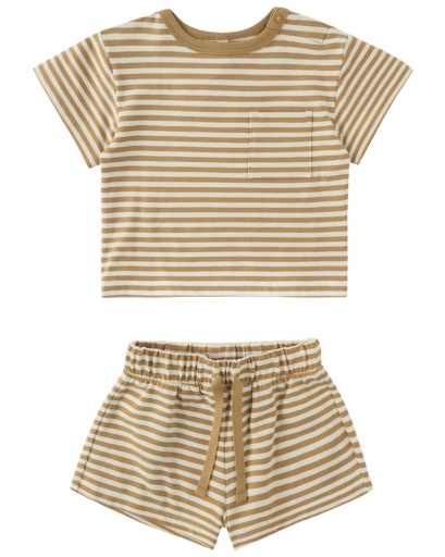This brushed jersey set features a boxy pocket tee paired with drawstring shorts.