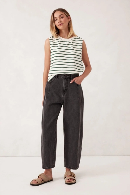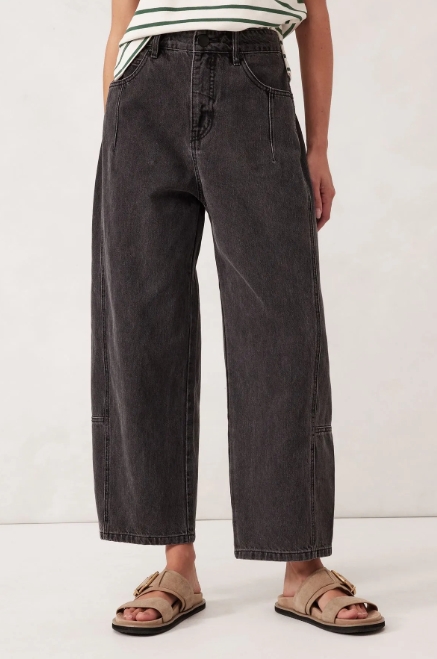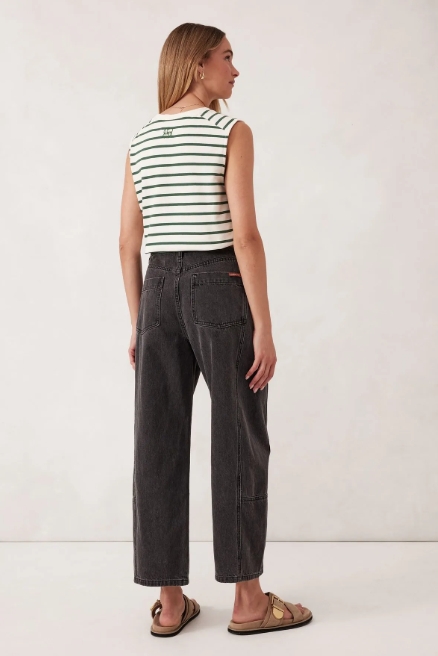 Introducing the Darted Tapered Barrel Jean, made from heavy rigid denim with 30% recycled cotton. With a mid-rise fit and a tapered barrel leg that hits just above the ankle, these jeans offer a slightly cropped, flattering silhouette. The dart detailing on the front pockets and side panel seam add a touch of subtle style. Your new go-to for effortless, everyday cool.