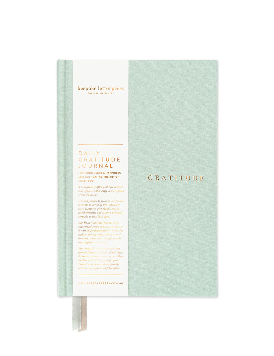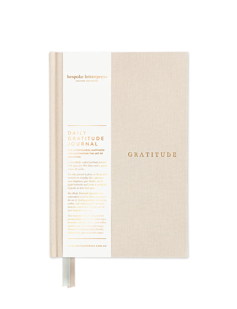 Our new beautiful linen bound gratitude journal features gold foil printing, gold gilded edges, decorative internal covers, satin ribbon markers and 112 heavyweight pages printed on chlorine-free pure wood fibre paper.