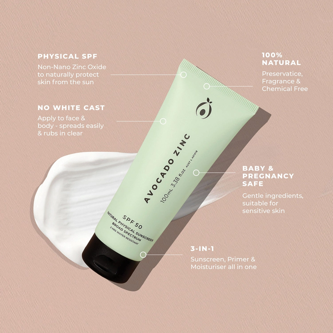 Size: 100ml Made locally in Perth, Western Australia, this 3-in-1 facial sunscreen, moisturiser and primer offers high-performance SPF 50 protection using non-nano zinc oxide to safely shield the skin from UVA and UVB rays. Formulated with a nourishing blend of Avocado Oil, Coconut Oil, Vitamin E, Calendula Oil and Castor Oil, it soothes and moisturises without weighing the skin down or leaving it feeling greasy. Lightweight and fast-absorbing, it blends in clear—no white cast in sight—and is gentle enough for sensitive skin. This 100% natural, physical sunscreen is safe for use during pregnancy, breastfeeding, and even on babies. It’s preservative-free, fragrance-free, vegan, cruelty-free, and reef friendly, with a 2-hour water resistance and a 3-year shelf life. Note: All our products are oil-based to remain 100% natural and preservative free. The plant oils used are 98% non-comedogenic and absorb quickly, leaving a dewy, moisturised finish without clogging pores.
